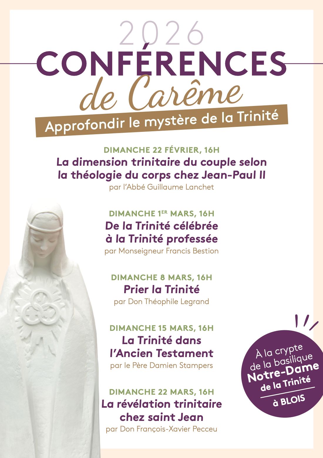 – Avec le sanctuaire Notre Dame de la Trinité (boulevard Carnot à Blois) les dimanches de Carême (1er, 8, 15, 22 mars) : à 16h à la basilique Notre-Dame de la Trinité, conférences de Carême sur le thème de la Trinité