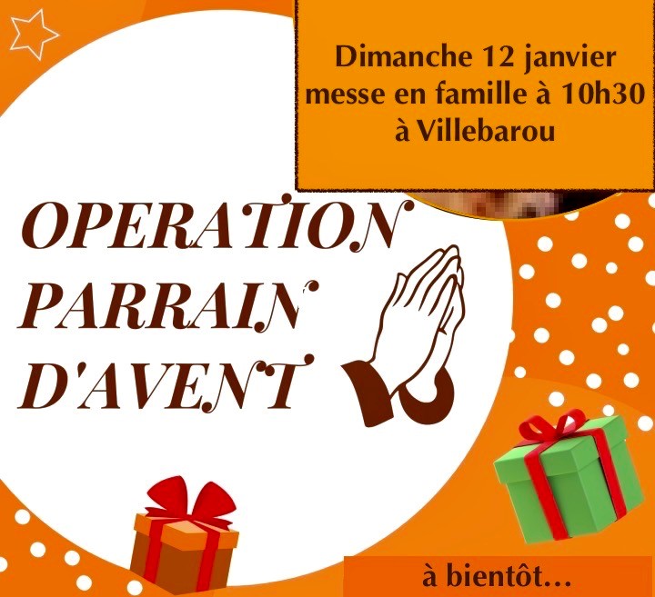 Messe en famille à 10h30 à Villebarou dimanche 12 janvier Comme prévu pour ceux qui ont participé aux « parrains d’Avent », vous rencontrerez à la fin de la messe de dimanche prochain, votre filleul. Vous vous révélerez à lui et lui remettrez votre cadeau symbolique (si vous le désirez). Nous partagerons tous ensemble, un verre de […]